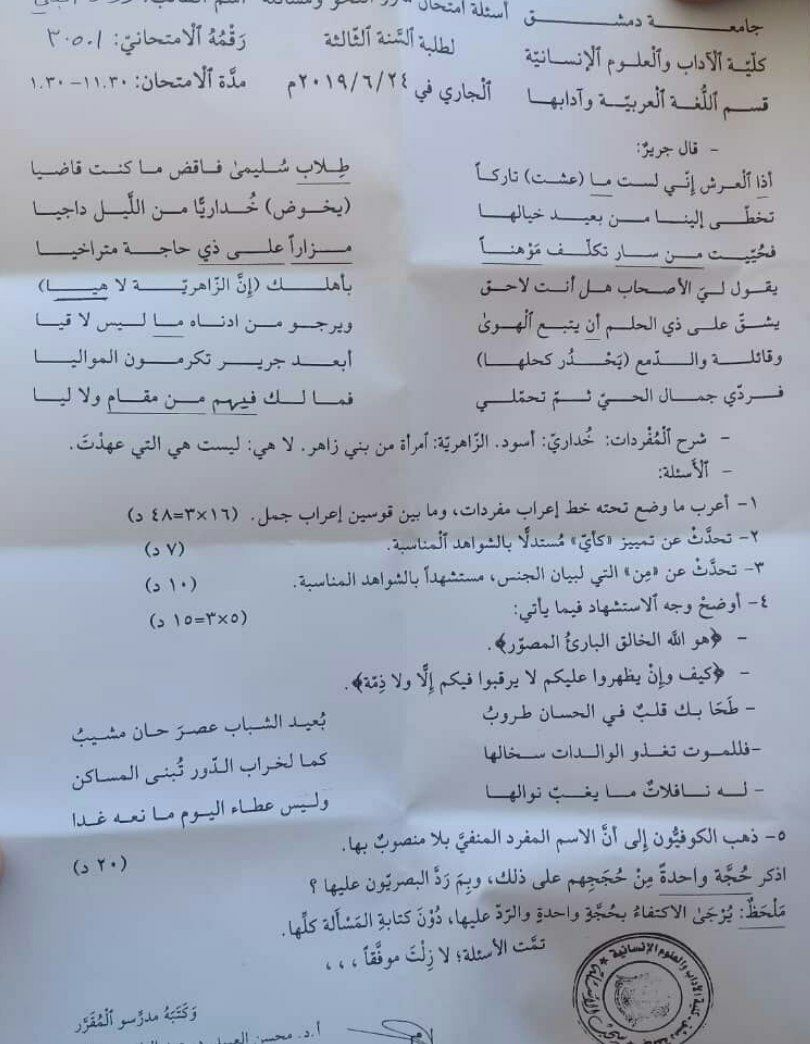 اسئلة اختبار في مادة النحو ومسائله للسنة3 فصل2 عام2019 جامعة دمشق كلية الاداب قسم لغة عربية