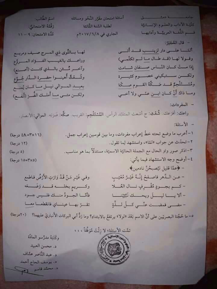 اسئلة اختبار في مادة النحو ومسائله للسنة3 فصل2 عام2017 جامعة دمشق كلية الاداب قسم لغة عربية