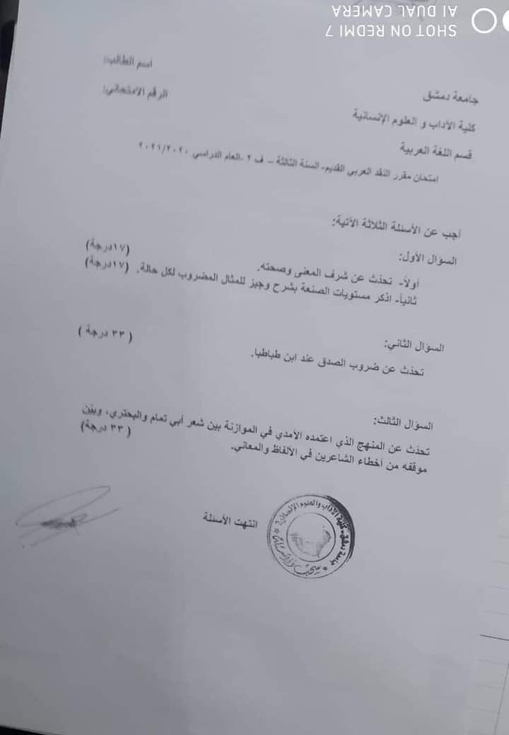 اسئلة اختبار في مادة النقد القديم للسنة3 فصل2 عام2021-2020 جامعة دمشق كلية الاداب قسم لغة عربية