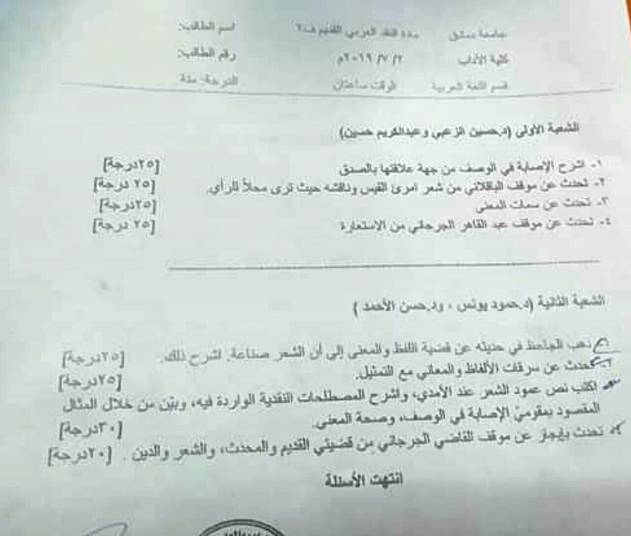 اسئلة اختبار في مادة النقد القديم للسنة3 فصل2 عام2019-2018 جامعة دمشق كلية الاداب قسم لغة عربية