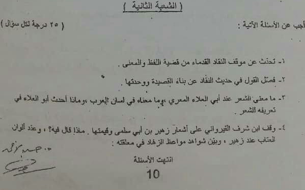 اسئلة اختبار في مادة النقد القديم للسنة3 فصل1 عام2014-2015 (شعبة2) جامعة دمشق كلية الاداب قسم لغة عربية