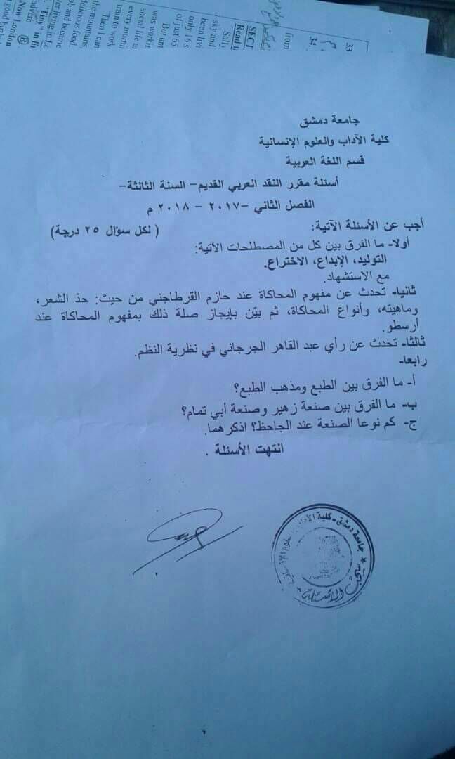 اسئلة اختبار في مادة النقد القديم للسنة3 فصل2 عام2018-2017 جامعة دمشق كلية الاداب قسم لغة عربية