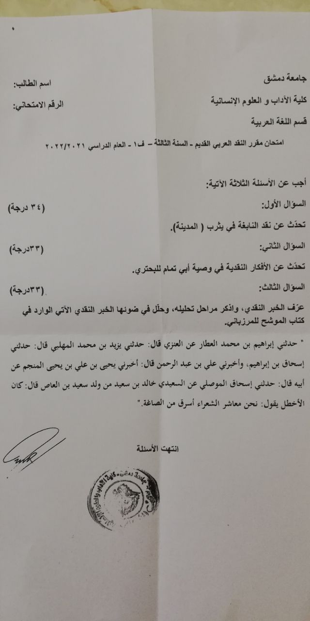 اسئلة اختبار في مادة النقد القديم للسنة3 فصل1 عام2021-2022 جامعة دمشق كلية الاداب قسم لغة عربية
