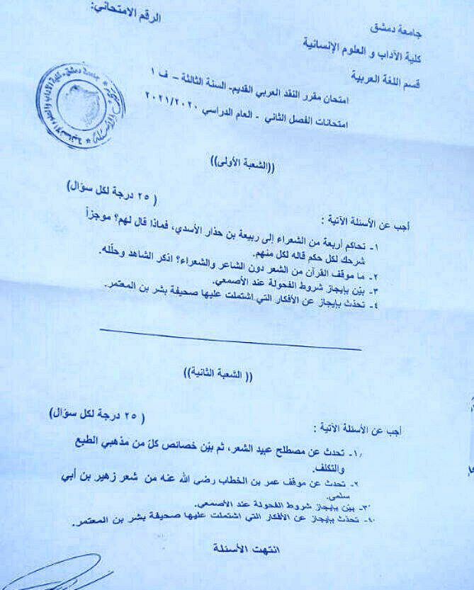 اسئلة اختبار في مادة النقد القديم للسنة3 فصل2 عام2021-2020 جامعة دمشق كلية الاداب قسم لغة عربية