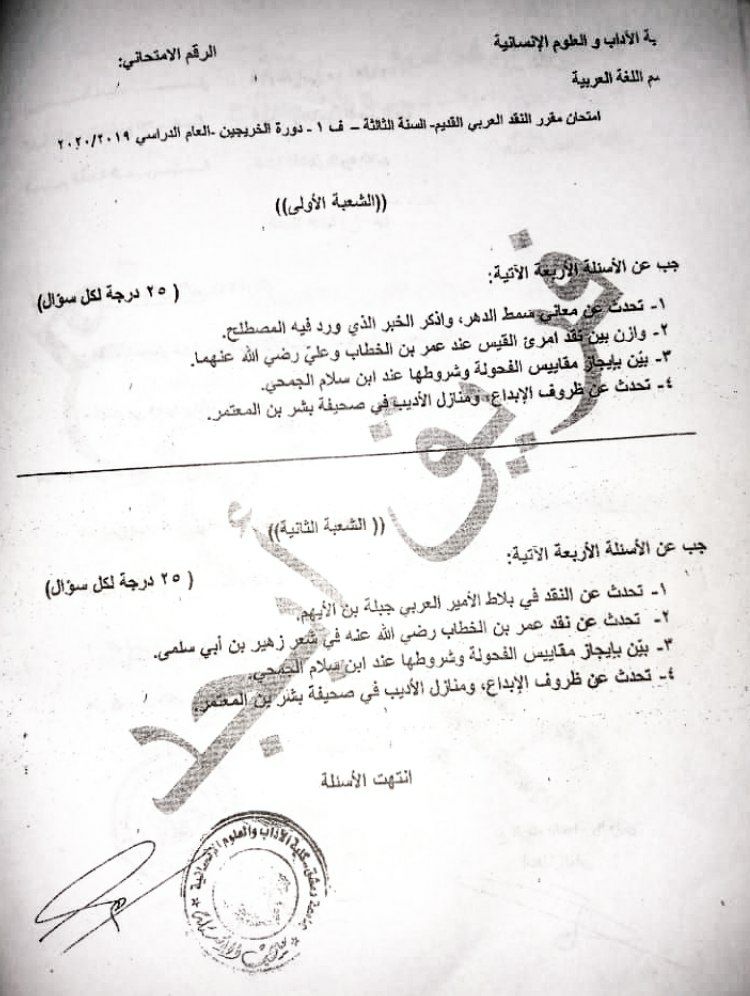 اسئلة اختبار في مادة النقد القديم للسنة3 فصل3 (خريجين) عام2019-2020 جامعة دمشق كلية الاداب قسم لغة عربية