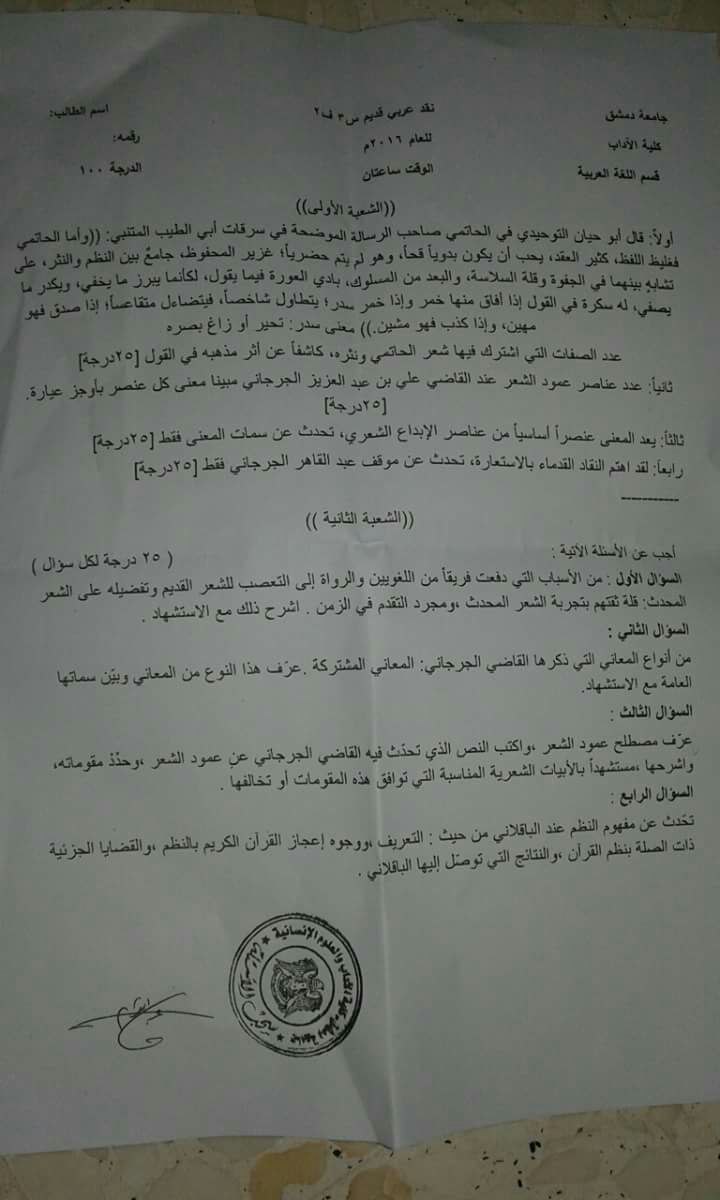 اسئلة اختبار في مادة النقد القديم للسنة3 فصل2 عام2016 جامعة دمشق كلية الاداب قسم لغة عربية