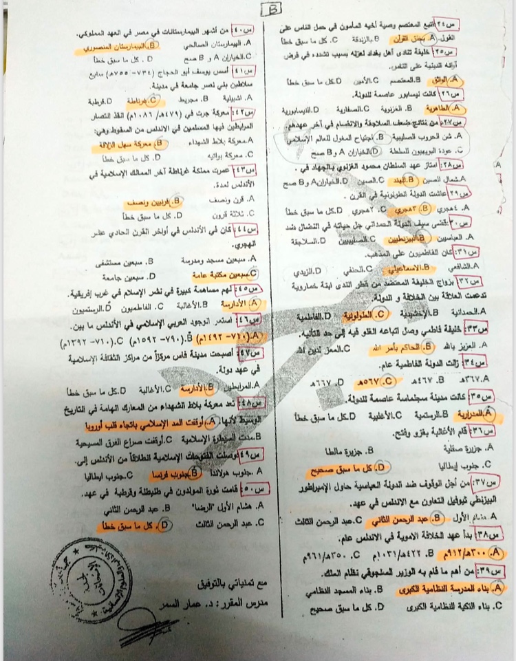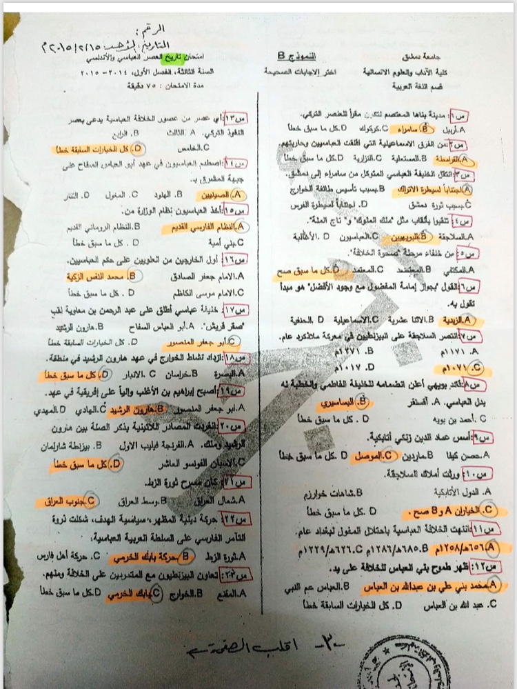 اسئلة اختبار في مادة التاريخ للسنة3 فصل1 عام2015-2014 جامعة دمشق كلية الاداب قسم لغة عربية