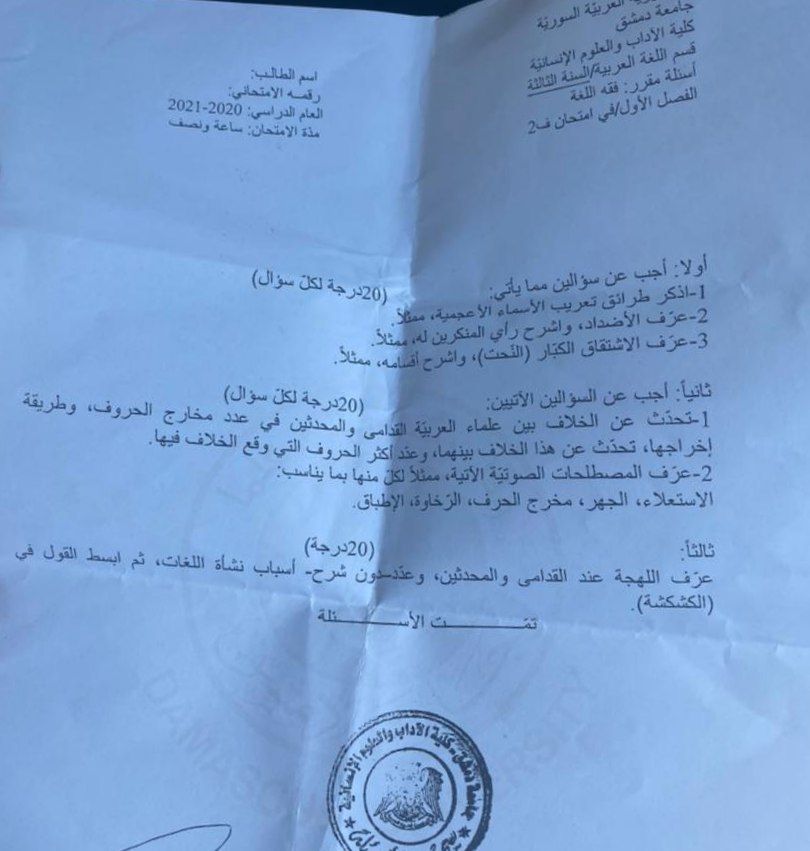 اسئلة اختبار في مادة فقه اللغة العربية للسنة3 فصل2 عام2020-2021 جامعة دمشق كلية الاداب قسم لغة عربية