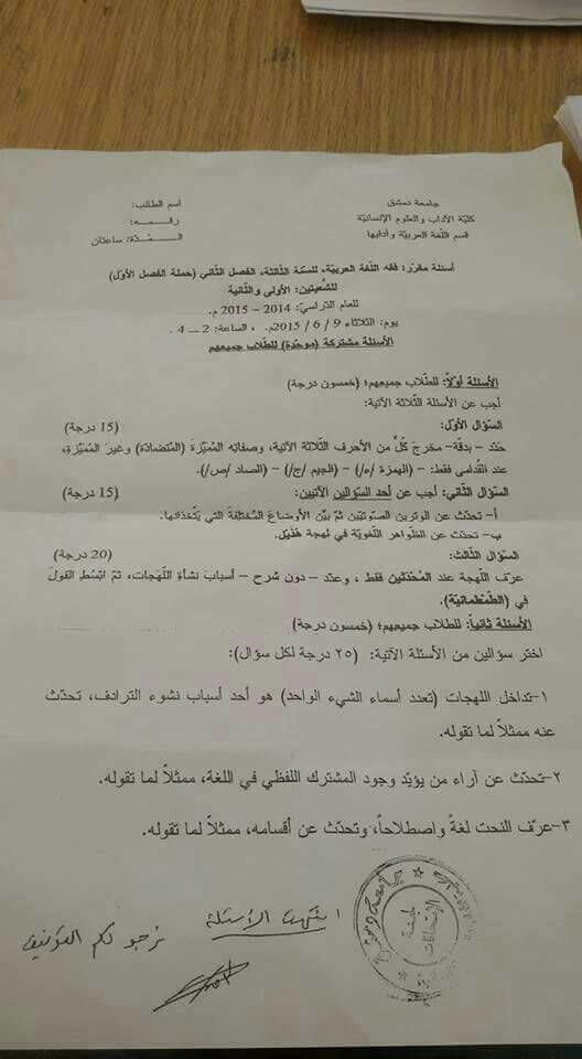 اسئلة اختبار في مادة فقه اللغة العربية للسنة3 فصل2 عام2014-2015 جامعة دمشق كلية الاداب قسم لغة عربية