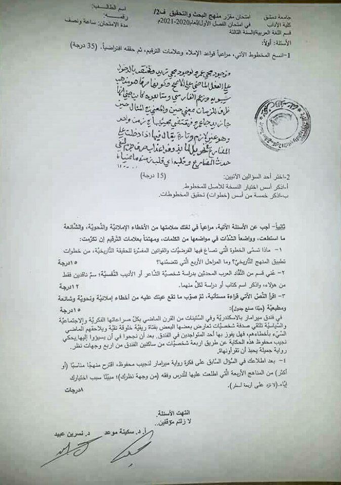 اسئلة اختبار في مادة منهج البحث والتحقيق للسنة3 فصل1 عام2021-2020 جامعة دمشق كلية الاداب قسم لغة عربية