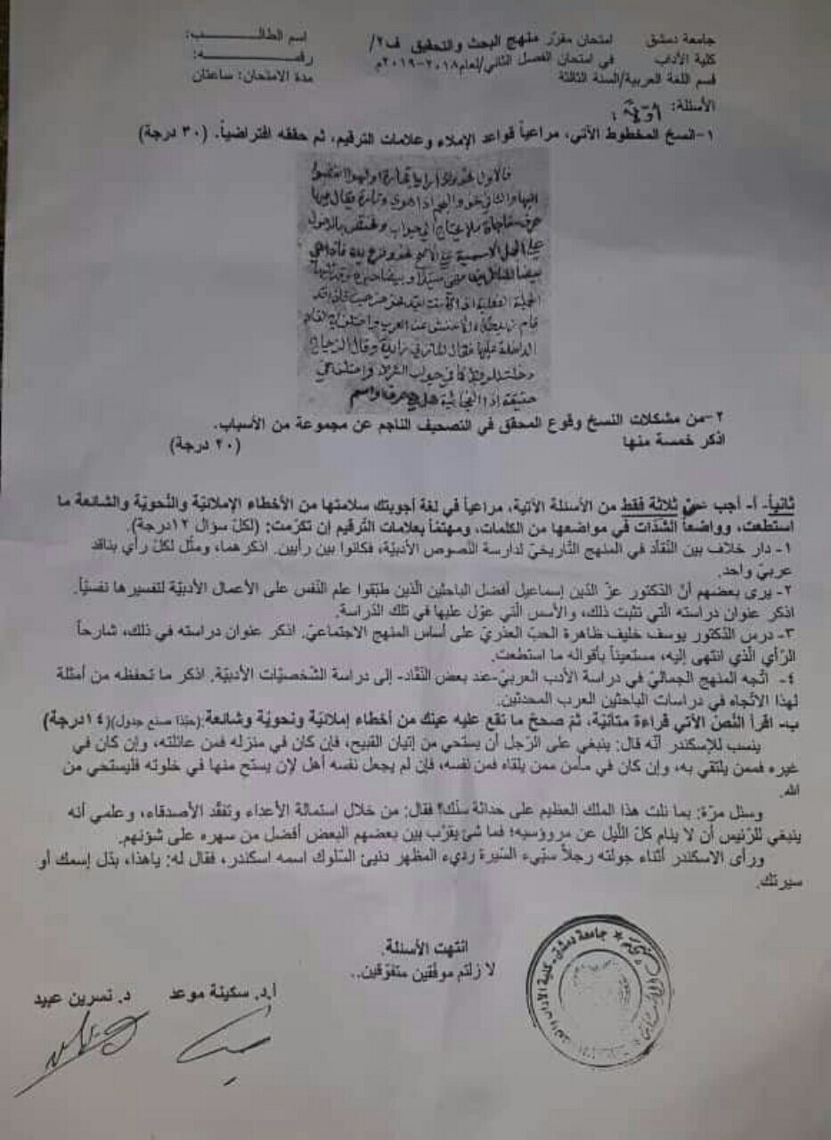 اسئلة اختبار في مادة منهج البحث والتحقيق للسنة3 فصل2 عام2019-2018 جامعة دمشق كلية الاداب قسم لغة عربية