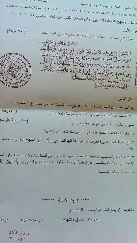 اسئلة اختبار في مادة منهج البحث والتحقيق للسنة3 فصل2 عام2016-2015 جامعة دمشق كلية الاداب قسم لغة عربية