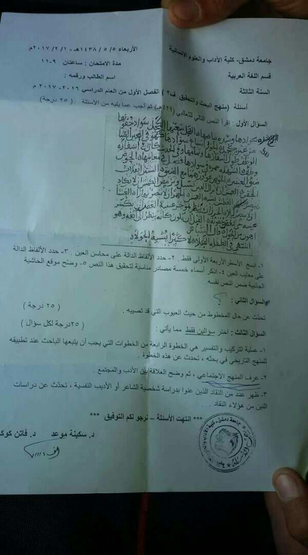 اسئلة اختبار في مادة منهج البحث والتحقيق للسنة3 فصل1 عام2017-2016 جامعة دمشق كلية الاداب قسم لغة عربية