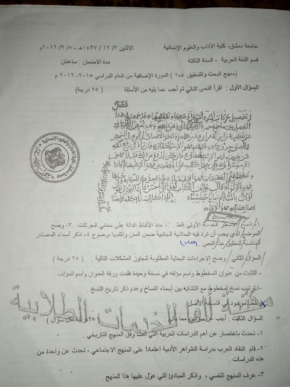 اسئلة اختبار في مادة منهج البحث والتحقيق للسنة3 فصل3 (تكميلية) عام2015-2016 جامعة دمشق كلية الاداب قسم لغة عربية