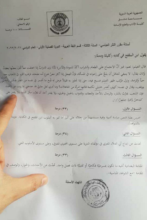 اسئلة اختبار في مادة النثر العباسي للسنة3 فصل1 عام2021-2022 جامعة دمشق كلية الاداب قسم لغة عربية