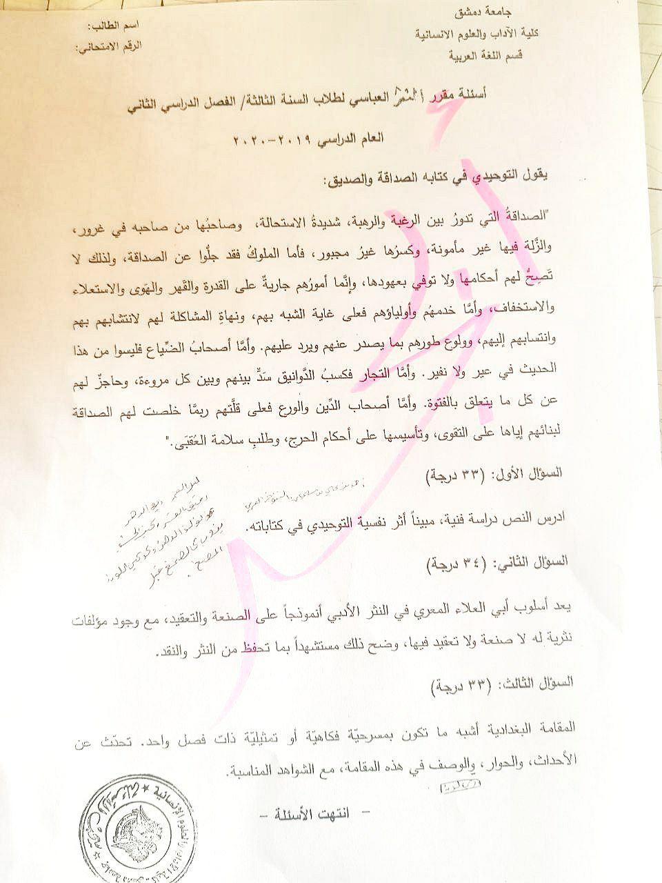 اسئلة اختبار في مادة النثر العباسي للسنة3 فصل2 عام2019-2020 جامعة دمشق كلية الاداب قسم لغة عربية