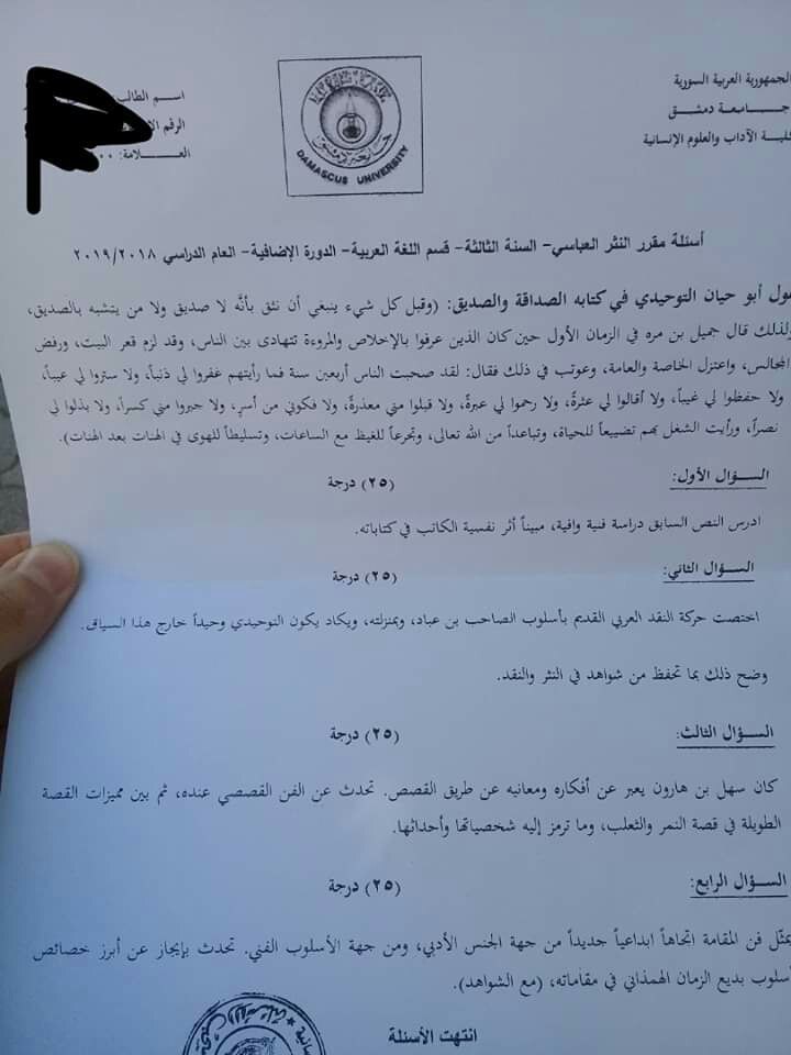 اسئلة اختبار في مادة النثر العباسي للسنة3 فصل3 (تكميلية) عام2019-2018 جامعة دمشق كلية الاداب قسم لغة عربية