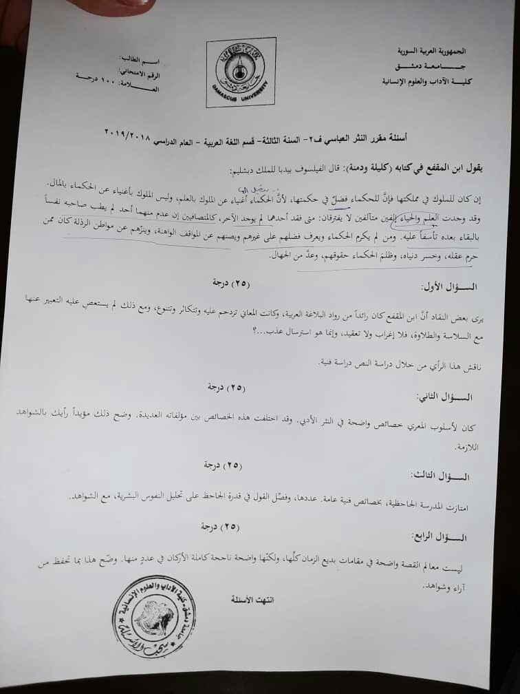 اسئلة اختبار في مادة النثر العباسي للسنة3 فصل2 عام2019-2018 جامعة دمشق كلية الاداب قسم لغة عربية