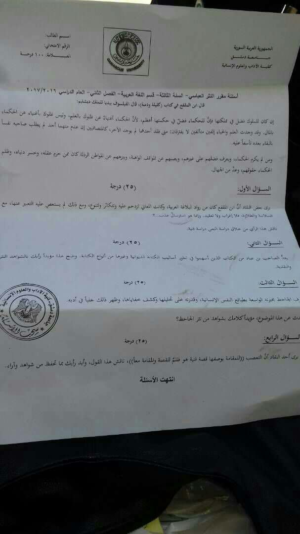 اسئلة اختبار في مادة النثر العباسي للسنة3 فصل2 عام2017-2016 جامعة دمشق كلية الاداب قسم لغة عربية