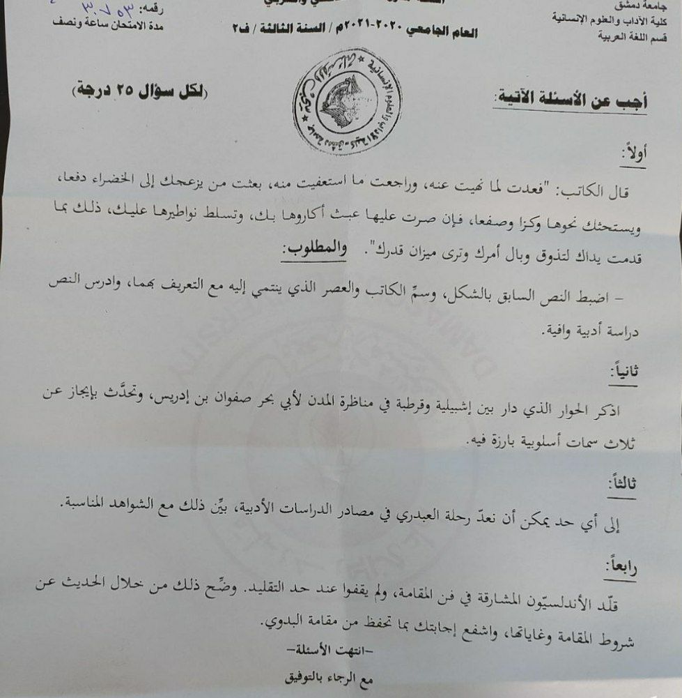 اسئلة اختبار في مادة النثر الاندلسي للسنة3 فصل2 عام2021-2020 جامعة دمشق كلية الاداب قسم لغة عربية