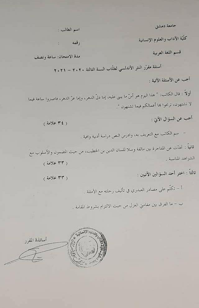 اسئلة اختبار في مادة النثر الاندلسي للسنة3 فصل1 عام2021-2020 جامعة دمشق كلية الاداب قسم لغة عربية