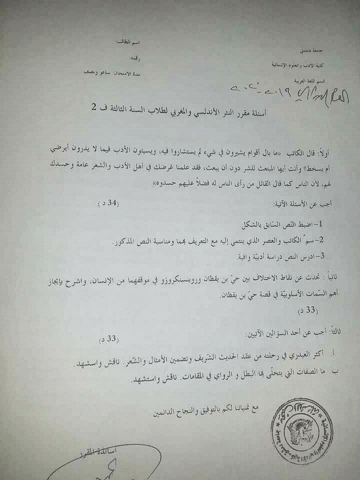 اسئلة اختبار في مادة النثر الاندلسي للسنة3 فصل2 عام2019-2020 جامعة دمشق كلية الاداب قسم لغة عربية