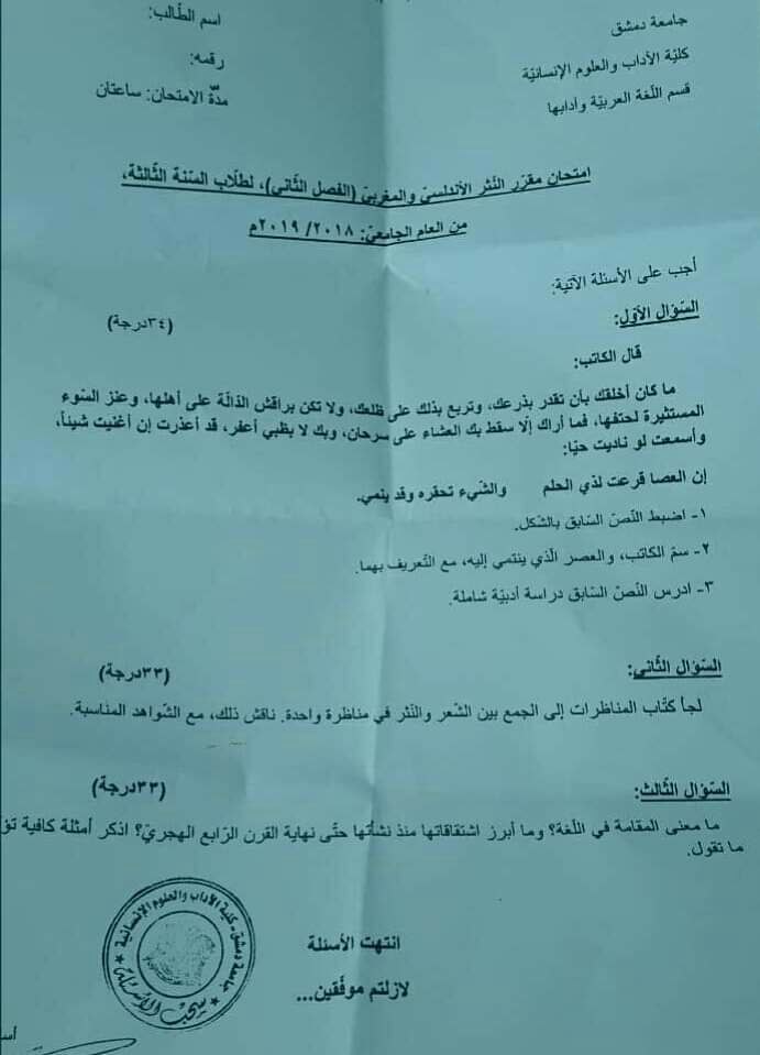 اسئلة اختبار في مادة النثر الاندلسي للسنة3 فصل2 عام2019-2018 جامعة دمشق كلية الاداب قسم لغة عربية