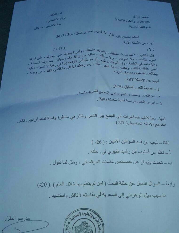 اسئلة اختبار في مادة النثر الاندلسي للسنة3 فصل2 عام2017 جامعة دمشق كلية الاداب قسم لغة عربية