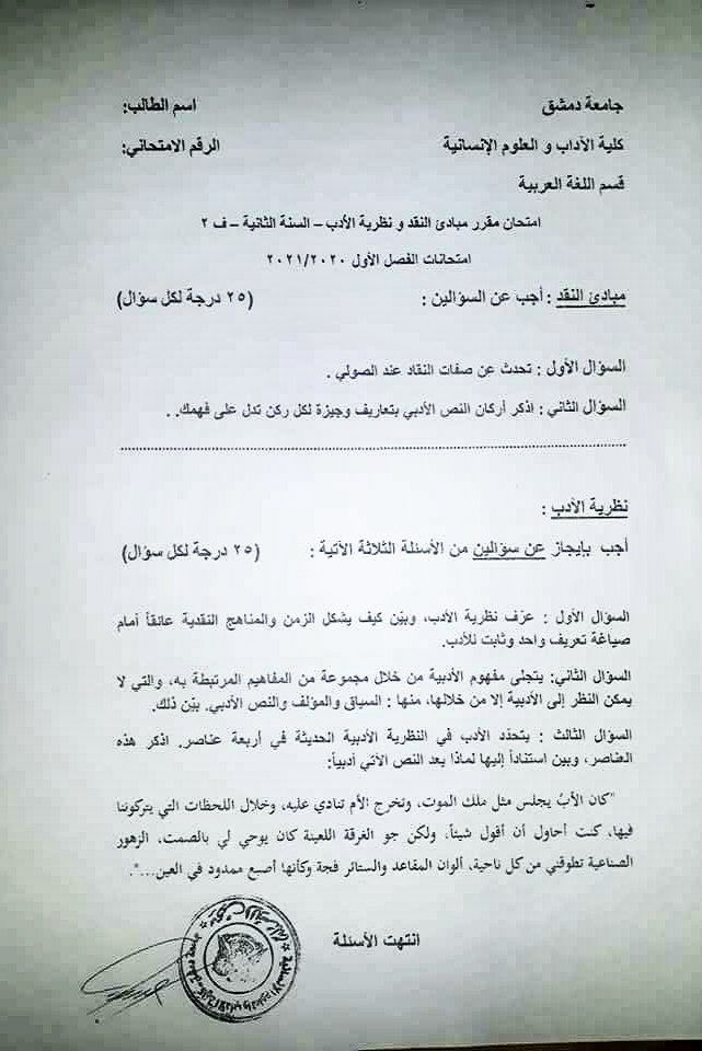 اسئلة اختبار في مادة مبادئ النقد ونظرية الادب للسنة2 فصل1 عام2020-2021 جامعة دمشق كلية الاداب قسم لغة عربية