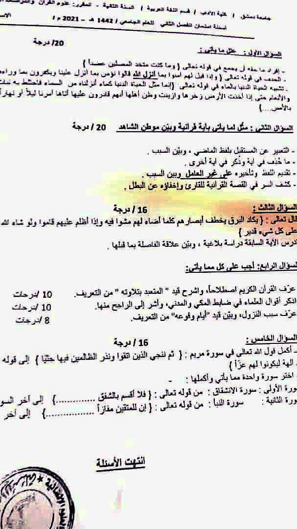 اسئلة اختبار في مادة علوم القرآن الكريم للسنة2 فصل2 عام2021-2020 جامعة دمشق كلية الاداب قسم لغة عربية