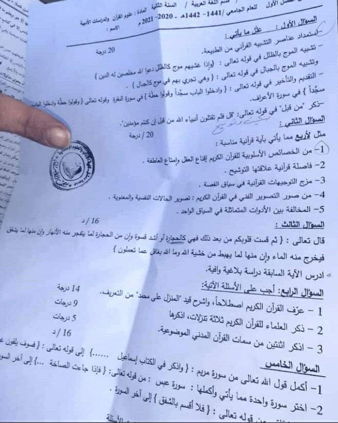 اسئلة اختبار في مادة علوم القرآن الكريم للسنة2 فصل1 عام2021-2020 جامعة دمشق كلية الاداب قسم لغة عربية