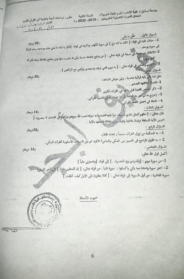 اسئلة اختبار في مادة علوم القرآن الكريم للسنة2 فصل3 عام2020-2019 جامعة دمشق كلية الاداب قسم لغة عربية