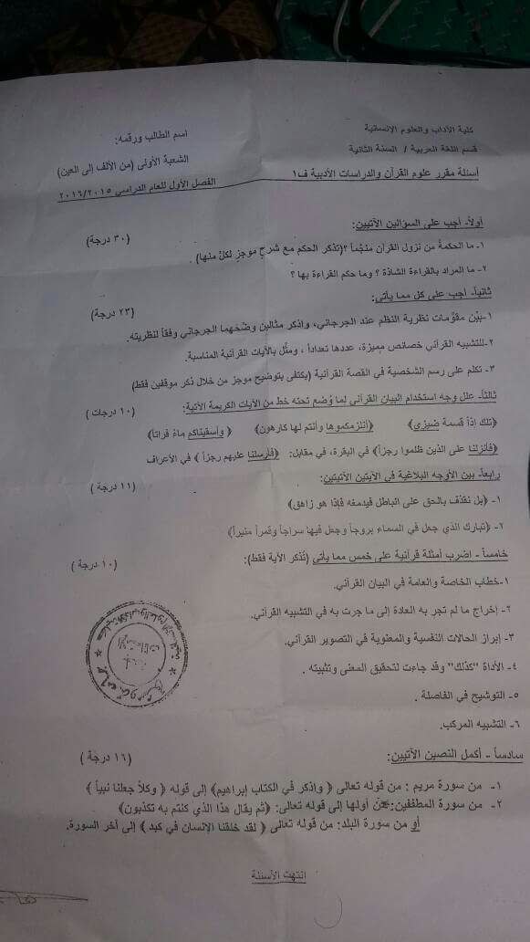 اسئلة اختبار في مادة علوم القرآن الكريم للسنة2 فصل1 عام2016-2015 (شعبة1) جامعة دمشق كلية الاداب قسم لغة عربية