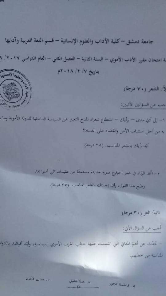 اسئلة اختبار في مادة الادب الاموي للسنة2 فصل1 عام2018-2017 جامعة دمشق كلية الاداب قسم لغة عربية