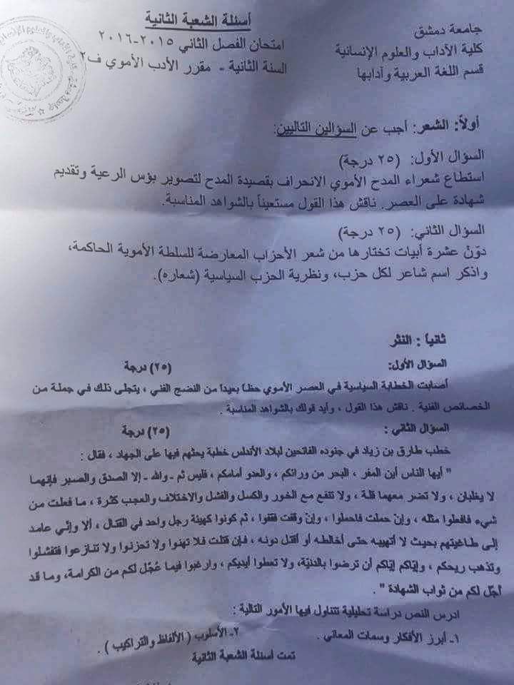 اسئلة اختبار في مادة الادب الاموي للسنة2 فصل2 عام2015-2016 (شعبة2) جامعة دمشق كلية الاداب قسم لغة عربية