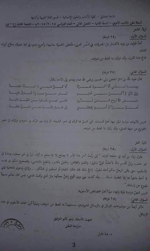 اسئلة اختبار في مادة الادب الاموي للسنة2 فصل2 عام2015-2014 (شعبة2) جامعة دمشق كلية الاداب قسم لغة عربية