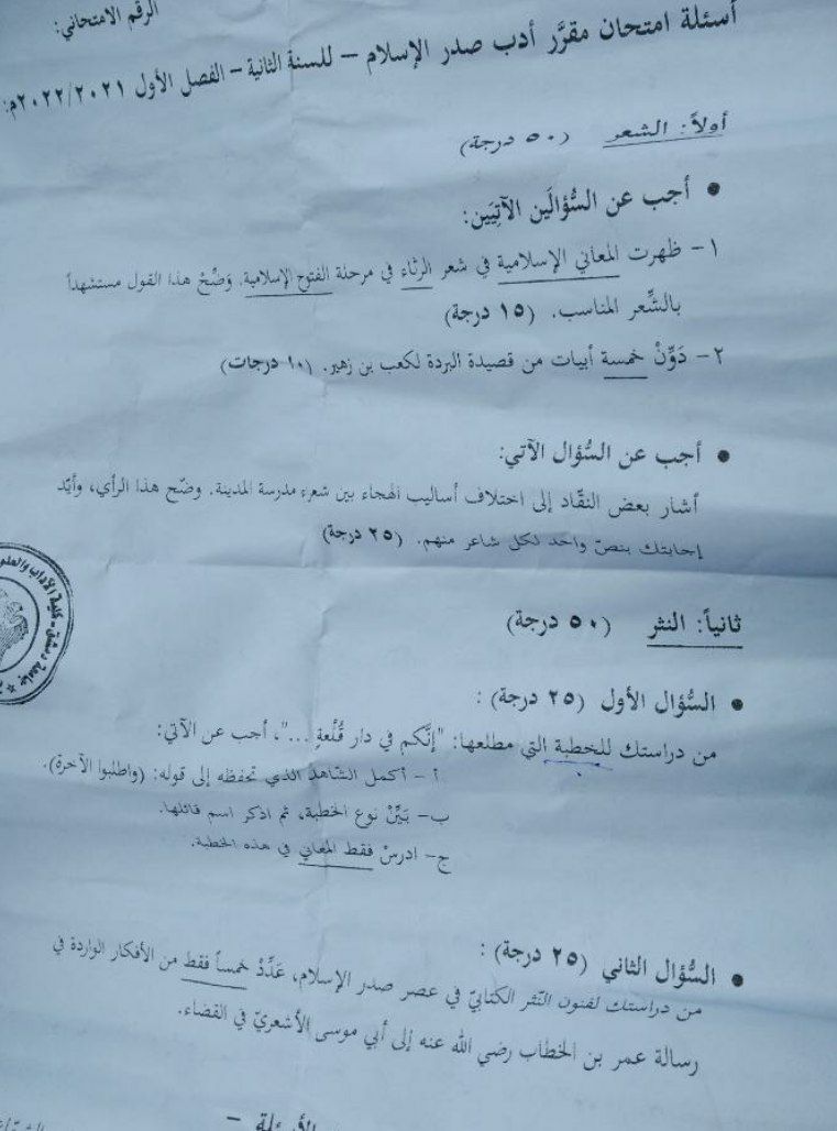 اسئلة اختبار في مادة ادب صدر الاسلام للسنة2 فصل1 عام2021-2022 جامعة دمشق كلية الاداب قسم لغة عربية