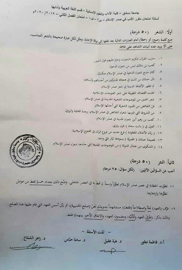 اسئلة اختبار في مادة ادب صدر الاسلام للسنة2 فصل2 عام2019-2020 جامعة دمشق كلية الاداب قسم لغة عربية