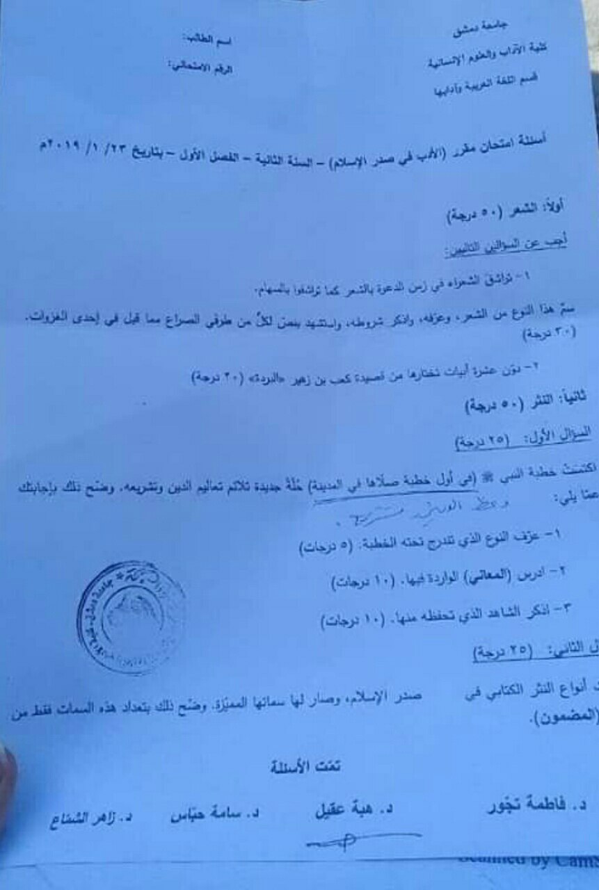 اسئلة اختبار في مادة ادب صدر الاسلام للسنة2 فصل1 عام2019-2018 جامعة دمشق كلية الاداب قسم لغة عربية