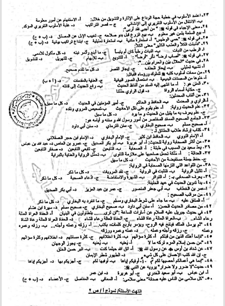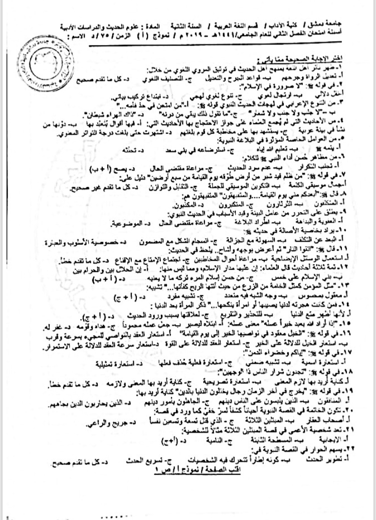 اسئلة اختبار في مادة علوم الحديث للسنة3 فصل2 عام2020-2019 (نموذج أ) جامعة دمشق كلية الاداب قسم لغة عربية