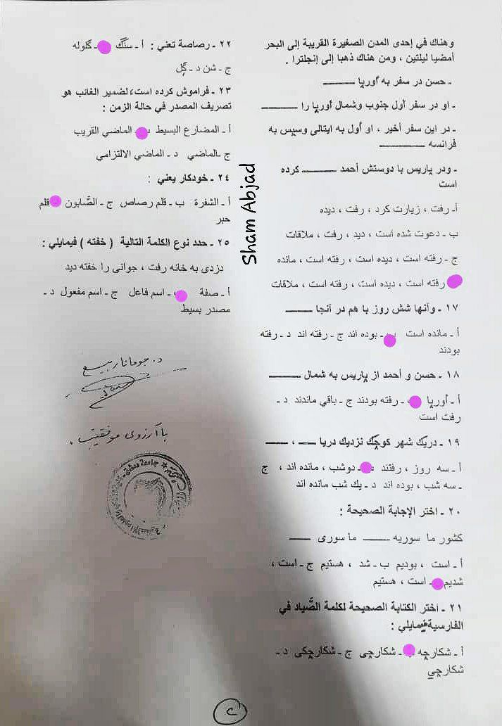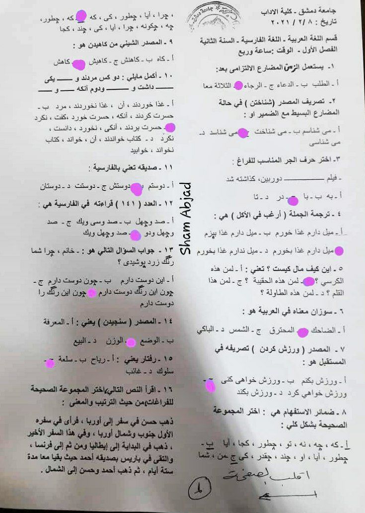 اسئلة اختبار في مادة اللغة الفارسية للسنة2 فصل1 عام2021-2020 جامعة دمشق كلية الاداب قسم لغة عربية