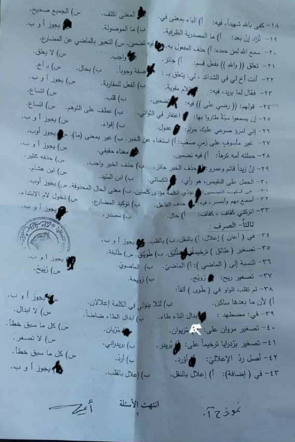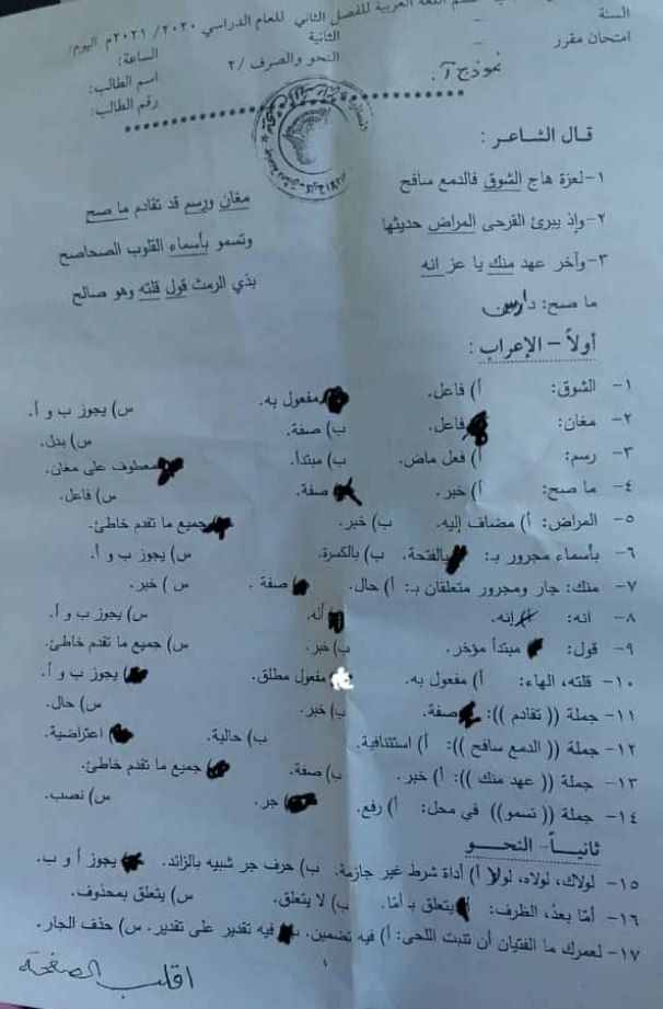 اسئلة اختبار في مادة النحو والصرف2 للسنة2 فصل2 عام2020-2021 جامعة دمشق كلية الاداب قسم لغة عربية