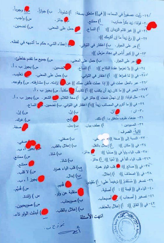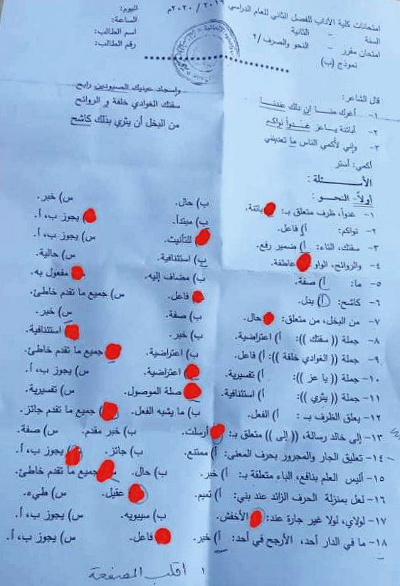 اسئلة اختبار في مادة النحو والصرف2 للسنة2 فصل2 عام2020-2019 (نموذج ب) جامعة دمشق كلية الاداب قسم لغة عربية