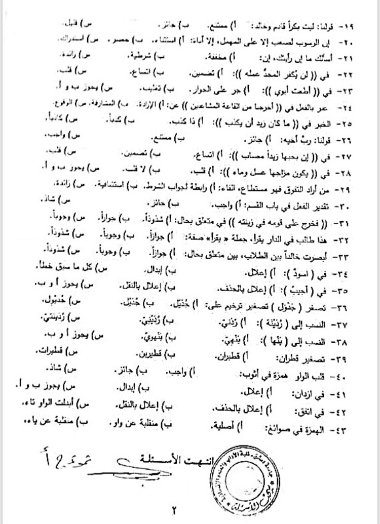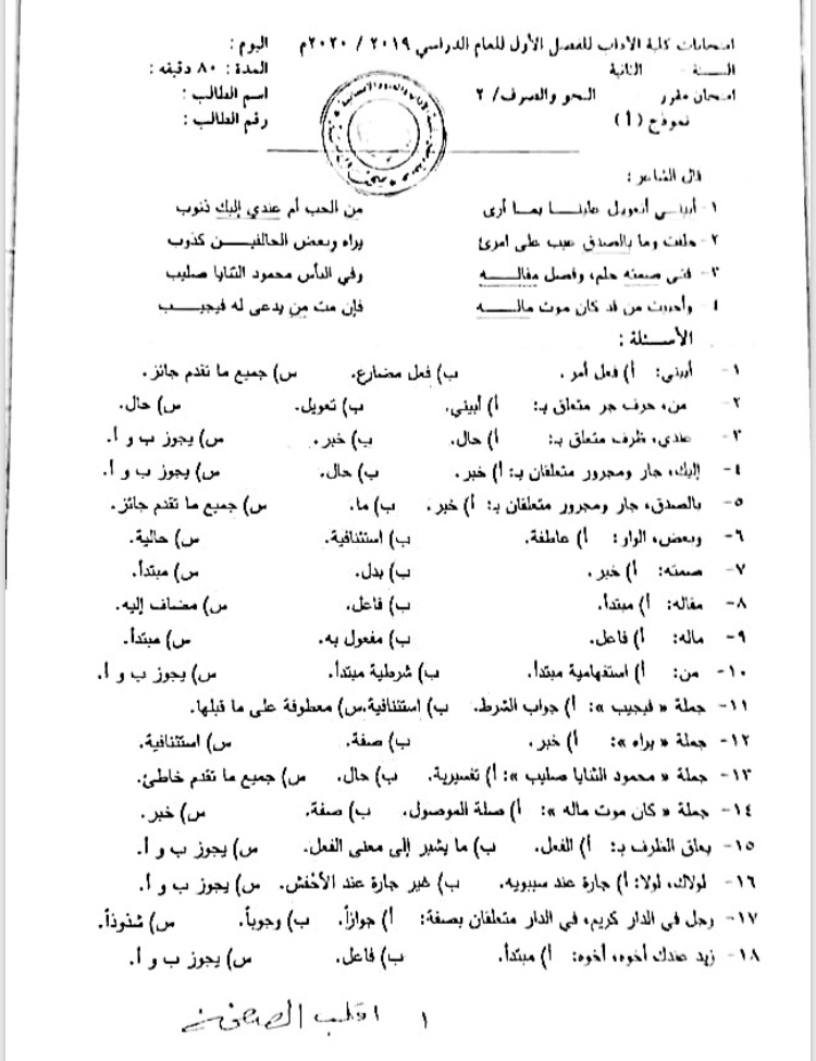 اسئلة اختبار في مادة النحو والصرف2 للسنة2 فصل1 عام2020-2019 جامعة دمشق كلية الاداب قسم لغة عربية