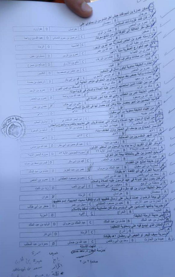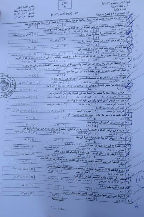 اسئلة اختبار في مادة تاريخ العرب والاسلام للسنة2 فصل1 عام2022 جامعة دمشق كلية الاداب قسم لغة عربية