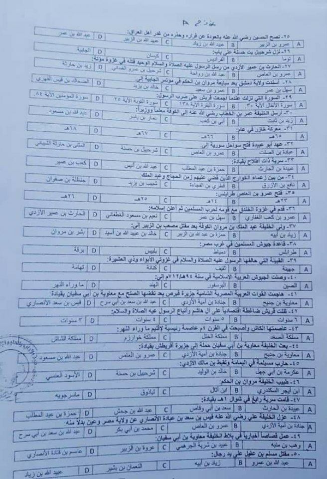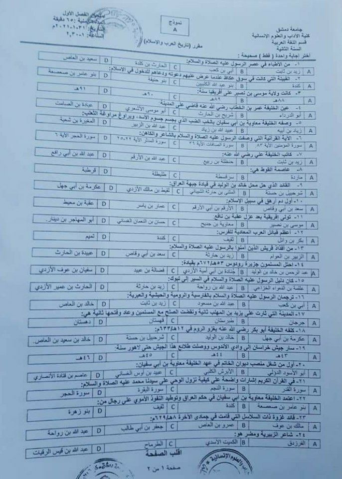 اسئلة اختبار في مادة تاريخ العرب والاسلام للسنة2 فصل1 عام2021 جامعة دمشق كلية الاداب قسم لغة عربية