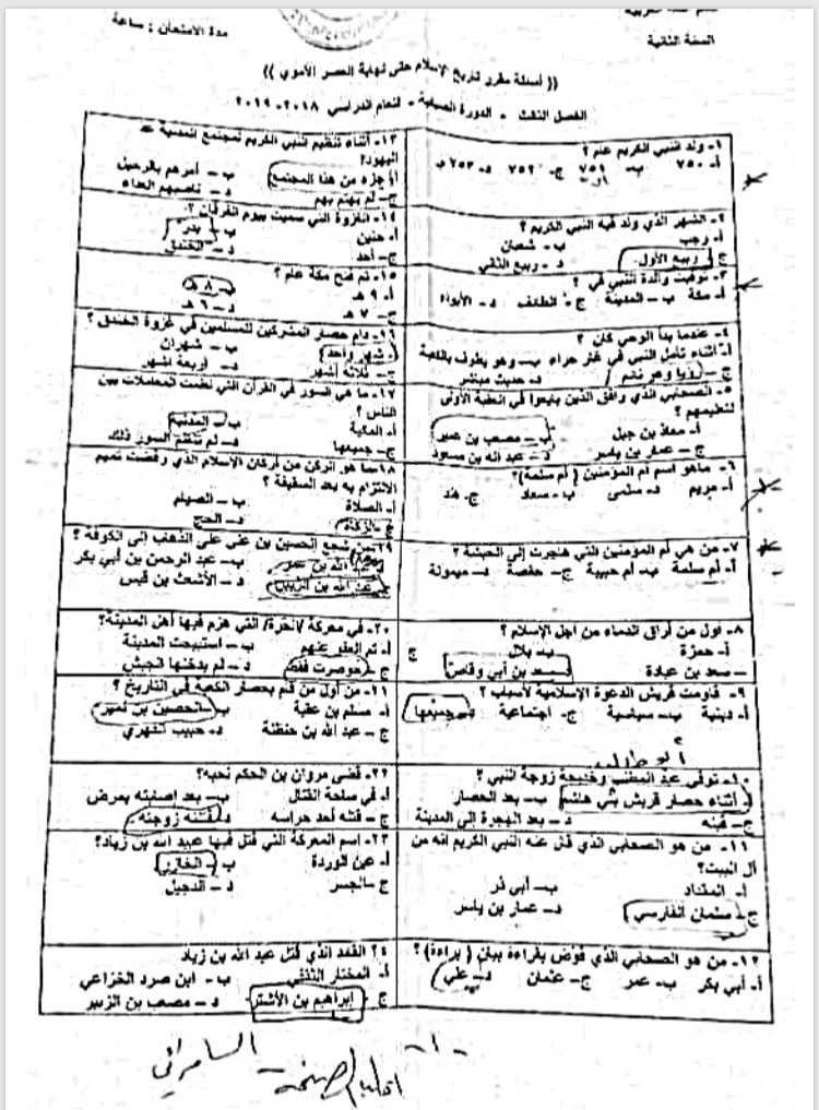 اسئلة اختبار في مادة تاريخ العرب والاسلام للسنة2 فصل3 عام2019 (ورقة واحدة) جامعة دمشق كلية الاداب قسم لغة عربية