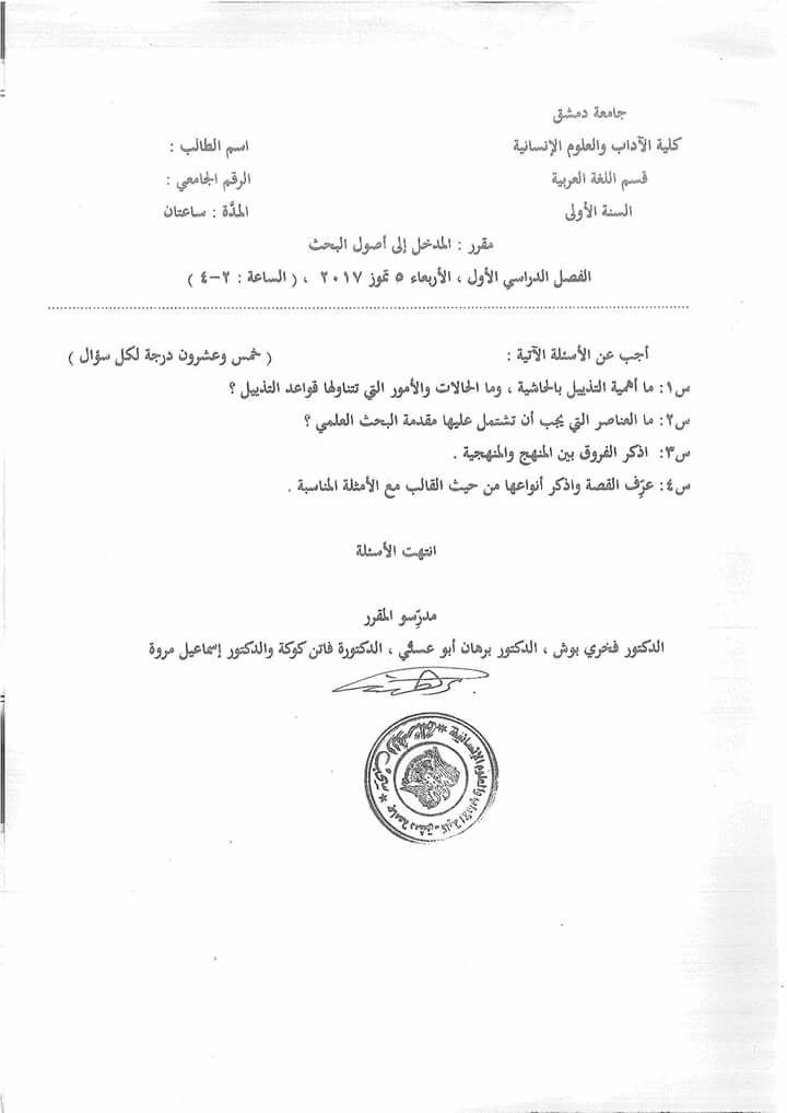 اسئلة اختبار في مادة اصول البحث للسنة1 فصل1 عام2017 جامعة دمشق كلية الاداب قسم لغة عربية