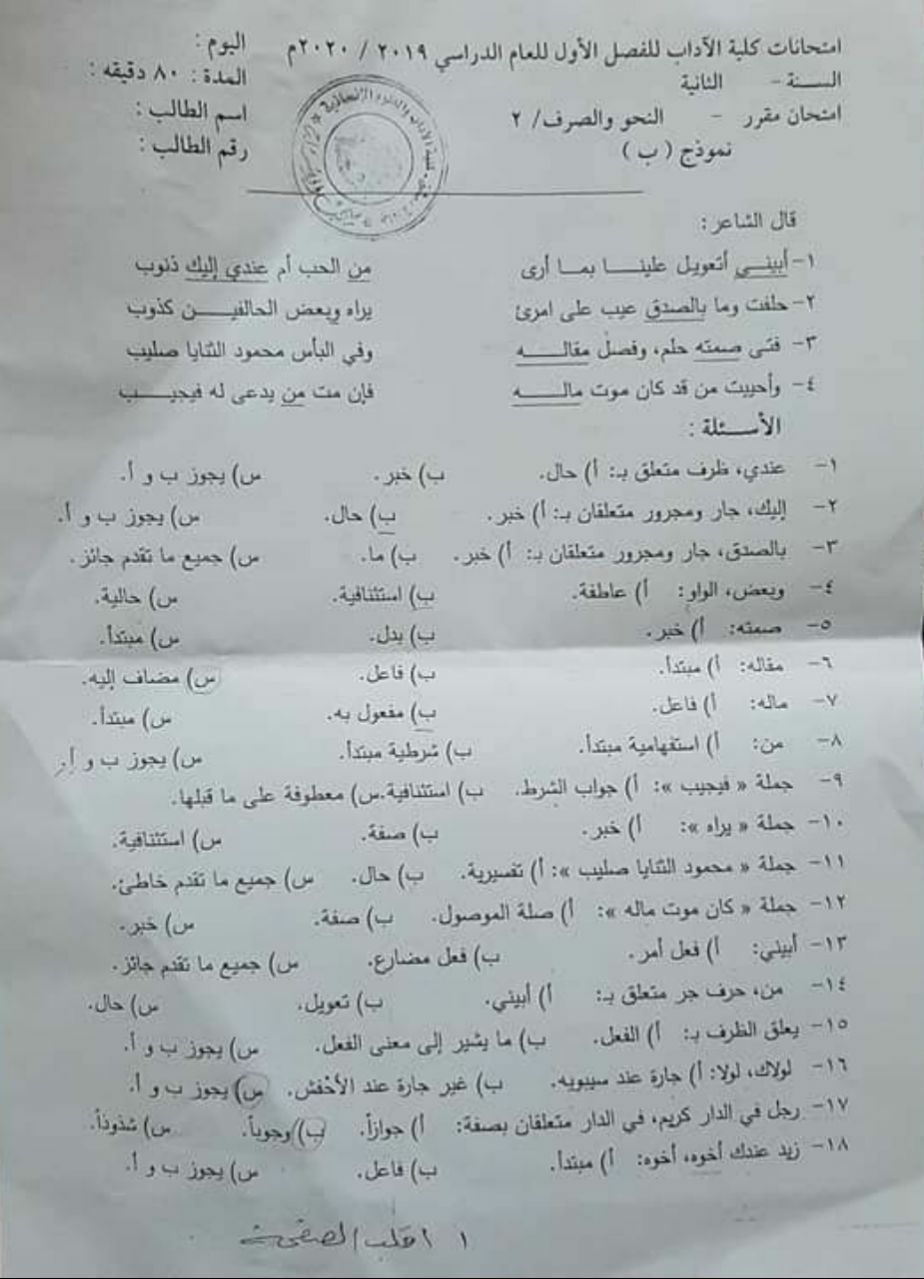 اسئلة اختبار في مادة النحو والصرف للسنة1 فصل1 عام2020 جامعة دمشق كلية الاداب قسم لغة عربية