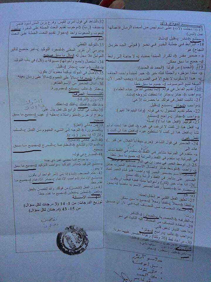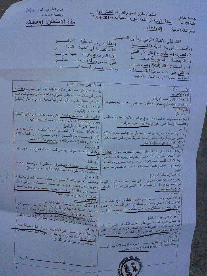 اسئلة اختبار في مادة النحو والصرف للسنة1 فصل3 عام2014 (نموذج أ) جامعة دمشق كلية الاداب قسم لغة عربية